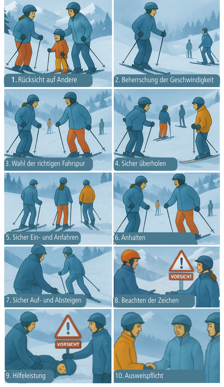 Die FIS-Verhaltensregeln gelten weltweit als Grundlage für sicheres und faires Verhalten im Wintersport. Sie helfen, Unfälle zu vermeiden und das Miteinander auf der Piste zu stärken: